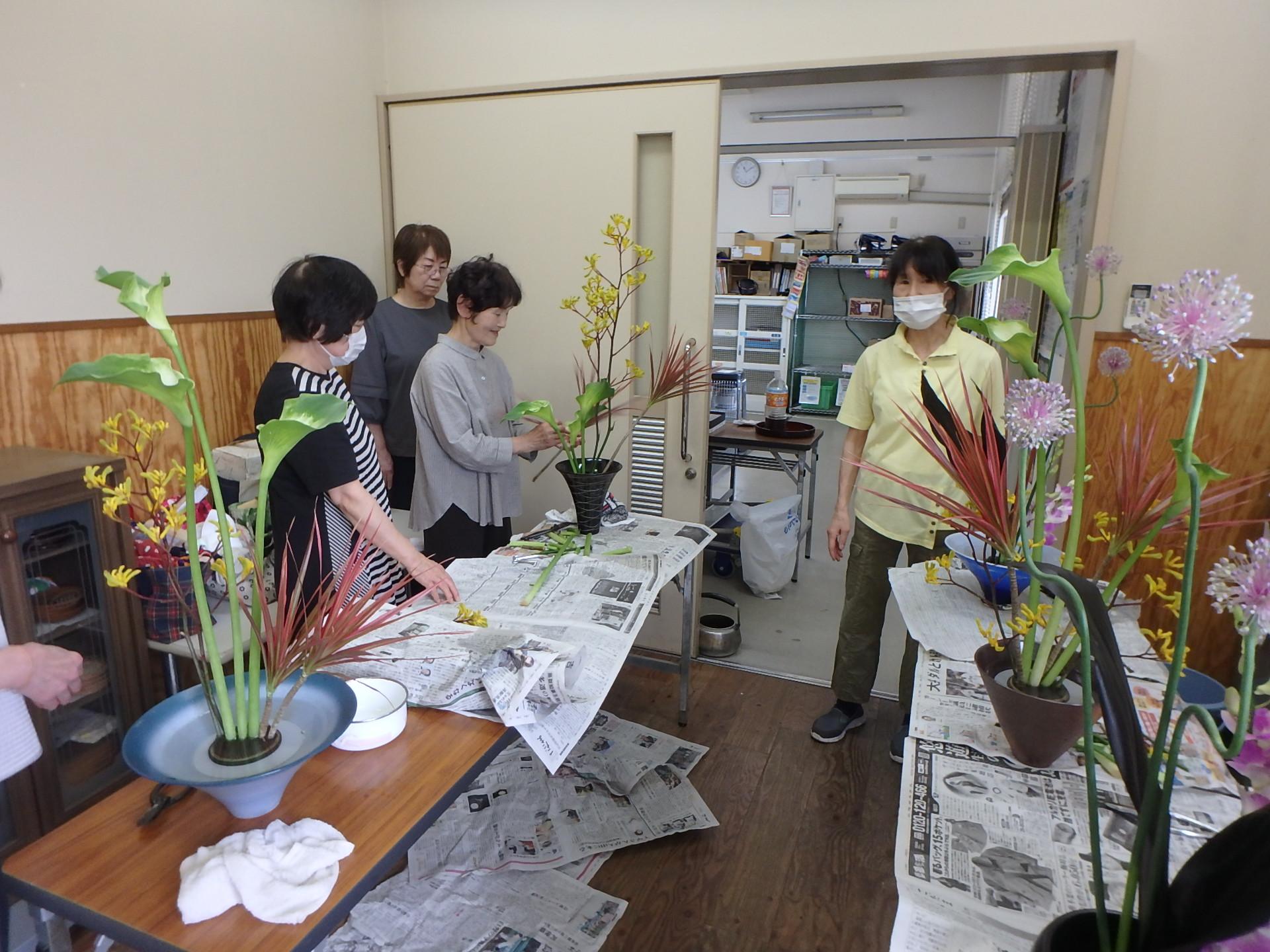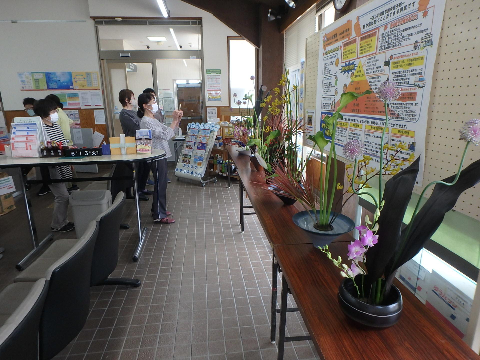 公民館講座の1つ、生け花教室(JPG)を毎月1回開催しています。今回は、郵便局を会場に教室が開かれました。完成した作品(JPG)は、郵便局のロビーにしばらくの間(6月26日まで)展示されますので、ぜひご覧ください。