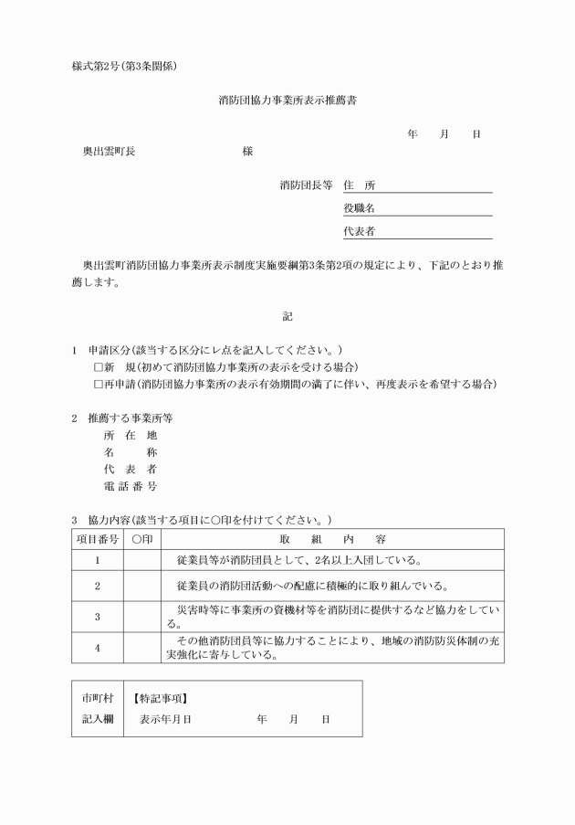 第3条 協力事業所として認定及び表示証の交付を受けようとする事業所等は、消防団協力事業所表示申請書(様式第1号)により、町長に申請を行うものとする。