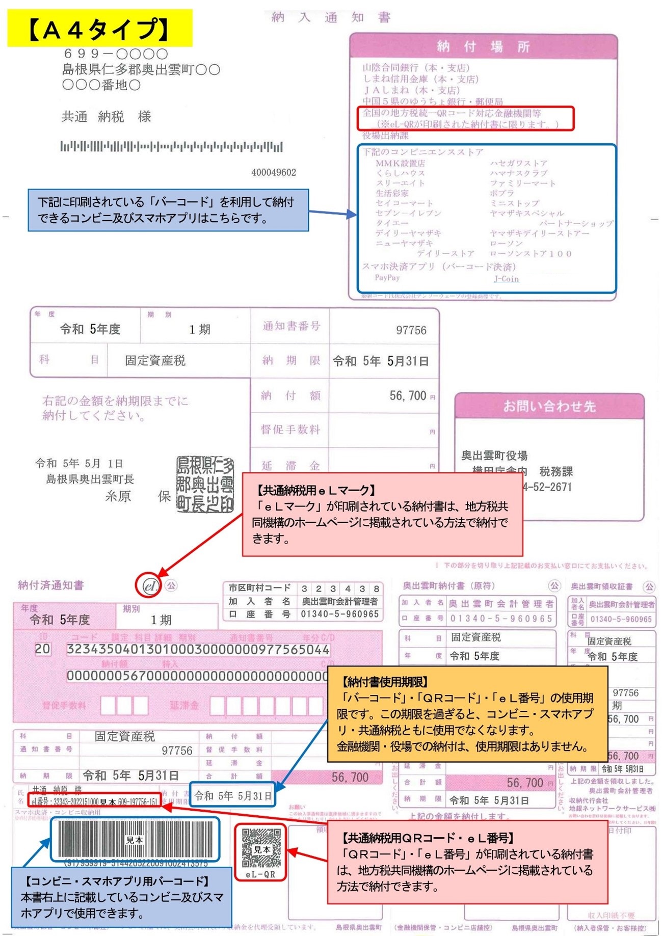 奥出雲町の指定金融機関だけでなく、QRコード(eL-QR)に対応した全国の金融機関で、納付書による納付ができます。