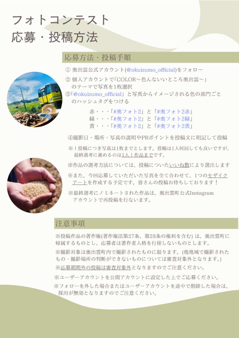 【COLOR〜色んないいところ奥出雲〜】をテーマに《赤・緑・黄》3つの色別部門で奥出雲のいいところ(グルメやスポット等)を投稿してもらう企画です。是非、奥出雲町公式Instagram(@okuizumo_official)をフォローのうえ、町内を巡ってご投稿ください。