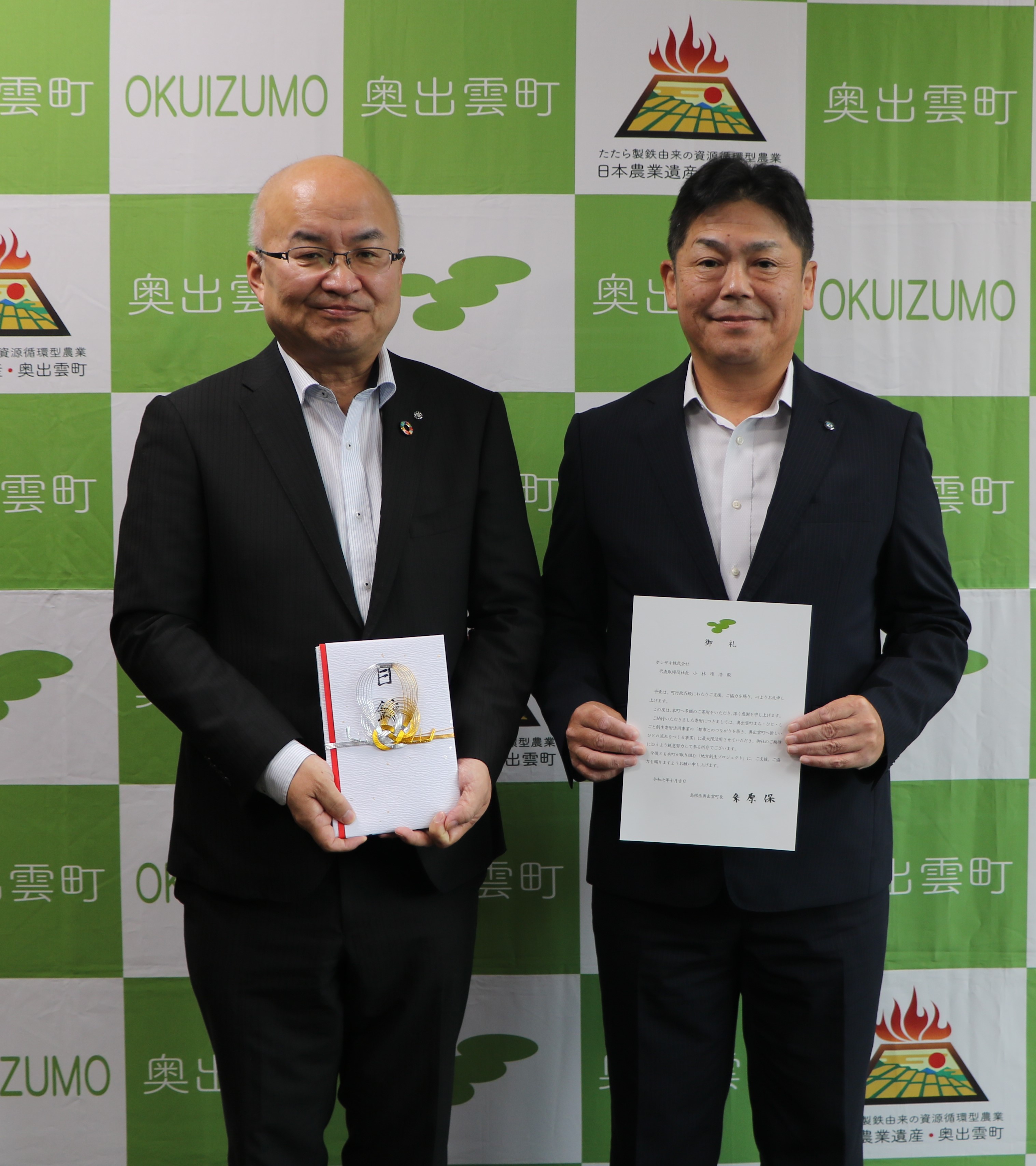 お礼状贈呈式の様子 右 ホシザキ株式会社 島根工場工場長 木村 順 様 左 糸原町長
